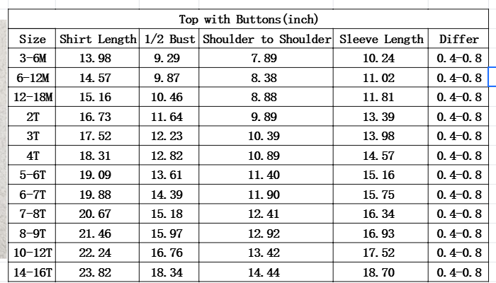 3-6M,6-12M,12-18M,2T,3T,4T,5-6T,6-7T,7-8T(extra $1),8-9T(extra $1),10-12T(extra $1),14-16T(extra $1)