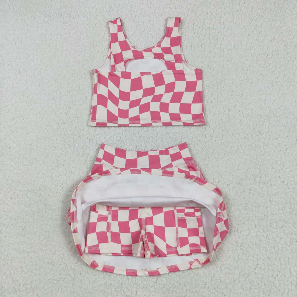 GSD2329 12-18M to 8-9T RTS girl clothes pink gingham girl summer set yoga clothes atheletic clothes