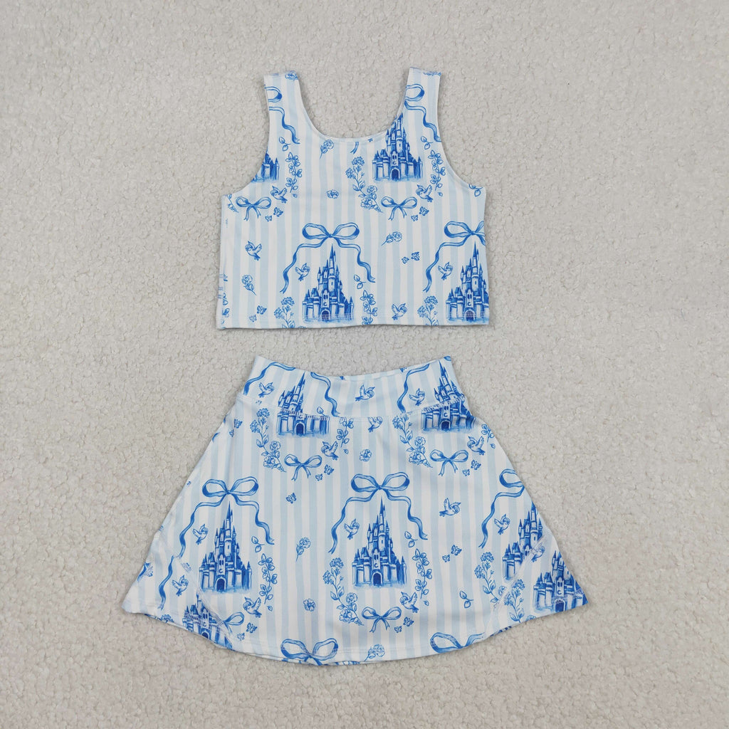 GSD3067 baby girl clothes blue castle toddler girl yoga skirt outfit sports clothing set
