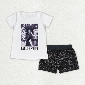 GSSO1458 baby girl clothes 1989 singer girl sequin shorts set
