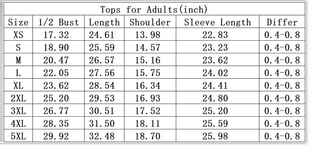 XS,S,M,L,XL,2XL,3XL,4XL,5XL